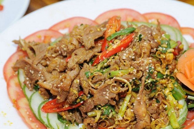Ingredients: 500 grams of roasted duck meat, 100 grams of onions, 200 grams of red and green bell peppers, 2 teaspoons of oyster sauce, 1 teaspoon of chili paste, 2 teaspoons of chili sauce, finely chopped shallots. Method: Step 1: Remove bones from the duck meat and cut into small pieces, then marinate with chili sauce, oyster sauce, and chili paste for about 15 - 20 minutes. Step 2: Cut the onions into bite-sized pieces, and slice the bell peppers. Step 3: Heat a pan, sauté the onions until fragrant, then add the duck and stir-fry until firm, then add the bell peppers, onions, and season again with spices, cook until done.