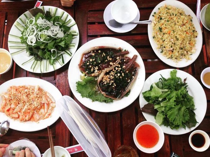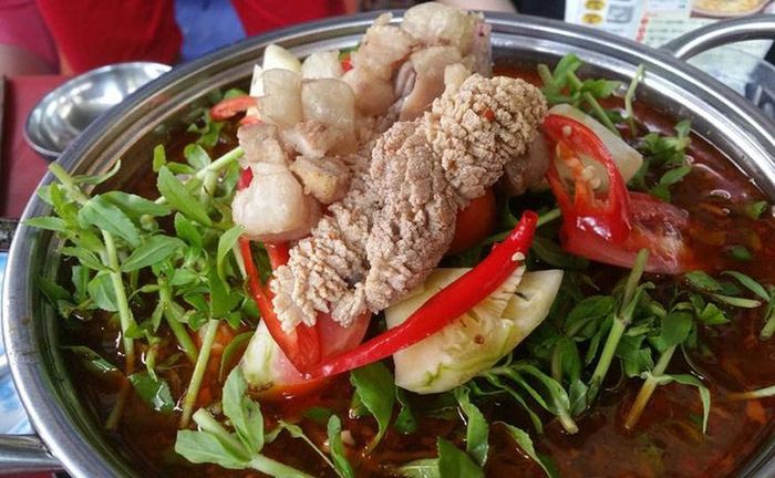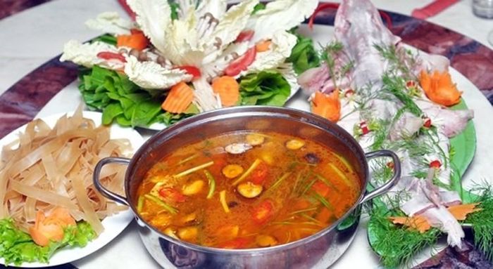 This is a type of fish with white, sweet, and nutritious meat, making it the preferred choice of people in Phan Thiet to cook the fish clam hot pot. The main ingredients of this distinctive hot pot include thinly sliced fish and the fish's marinated roe, adding extra appeal to the pot. The fish clam hot pot is a harmonious combination of the sour taste of tomatoes and pineapples, the spicy flavor of chili, the aroma of sautéed garlic and onions, the bright red color of tomatoes, and a few herbs, finely chopped green onions. When the hot pot is cooked, the broth will have a rich, sweet, sour, slightly spicy taste, so when enjoying it, there is no strong smell of sea fish. The fish clam hot pot is accompanied by fresh vegetables such as banana blossoms, shredded water spinach, bitter vegetables, corn, thinly sliced mint, and fresh vermicelli, along with a cup of pure Phan Thiet fish sauce. Fish clam hot pot is not only delicious and uniquely flavored, but also the way of eating expresses the close-knit relationships among people. The hot pot is placed in the center over a red charcoal stove. When the broth boils, the fragrant aroma stimulates the taste buds, and everyone sits around the hot pot, picking vegetables and slices of fish for each other.