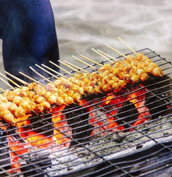 Squid teeth are essentially small pieces of meat on the head of a squid. Usually, during preparation, many people tend to discard these squid teeth, thinking they are inedible. However, the people of Binh Thuan quickly discovered the hidden potential in this seemingly discarded part. To cater to tourists, this dish is prepared in various ways, such as squid teeth sausage, salt-grilled squid teeth, and spicy grilled squid teeth... The commonality among these dishes is that they are all very attractive and unique. After being cleaned, the squid teeth are meticulously seasoned and threaded onto bamboo sticks, grilled over glowing red charcoal. This dish is most delicious when the squid teeth are fresh, ensuring crispiness and much more allure when grilled. When the squid teeth turn a bright yellow color and emit a fragrant aroma, that's when they are fully cooked.