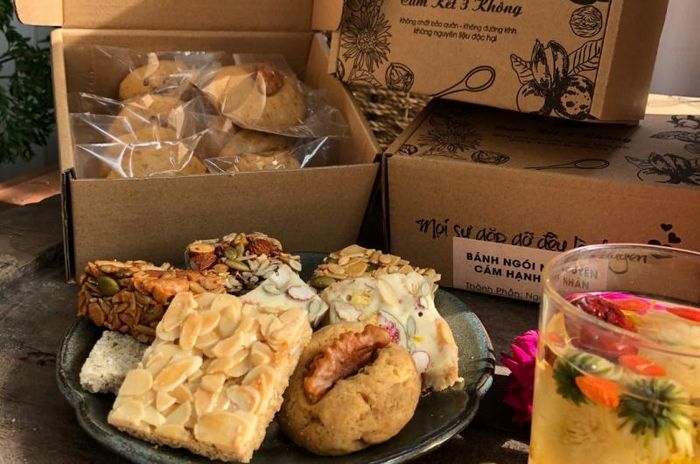 In addition to Nougat candies, Panna Cotta specializes in handmade cakes such as cookies, peanut cakes, traditional sesame cakes, almond cakes, conch-shaped cakes,... with many types of candies, jams, and teas made from natural flowers and fruits. Moreover, Panna Cotta also packages and sells sets in a beautiful and elegant manner, which you can buy as gifts for Tet holidays, which is very meaningful!