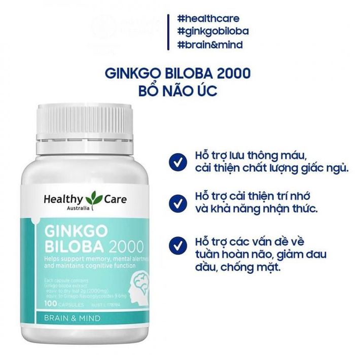 Healthy Care Ginkgo Biloba Brain Boosting Tablets 100 tablets are extracted from the ginkgo biloba fruit, offering numerous benefits to alleviate headaches, dizziness, and memory decline. The product enhances blood circulation in the brain, eliminating congestion and blockages in the cerebral arteries that can lead to memory decline in the elderly.