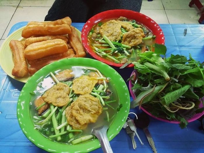 Along with the fried fish, the bowl includes fish cakes, boiled water spinach or mustard greens, and a side dish of fresh herbs available for those who want more. While the fish noodles here may not be as light as those found in Hanoi, and the fish less tender, it has its own distinct qualities. A unique feature of this place is the availability of fish heads, fish roe, and fish intestines (called 'tù và' in some regions due to its shape resembling a musical instrument). Customers can order a bowl with only the fish head, intestines, or roe, or even request a bowl of just the fish head served with broth, allowing for a leisurely experience of savoring each bite. The firm fish head meat has a unique, slightly chewy texture and a distinct flavor that is a treat for adventurous eaters.