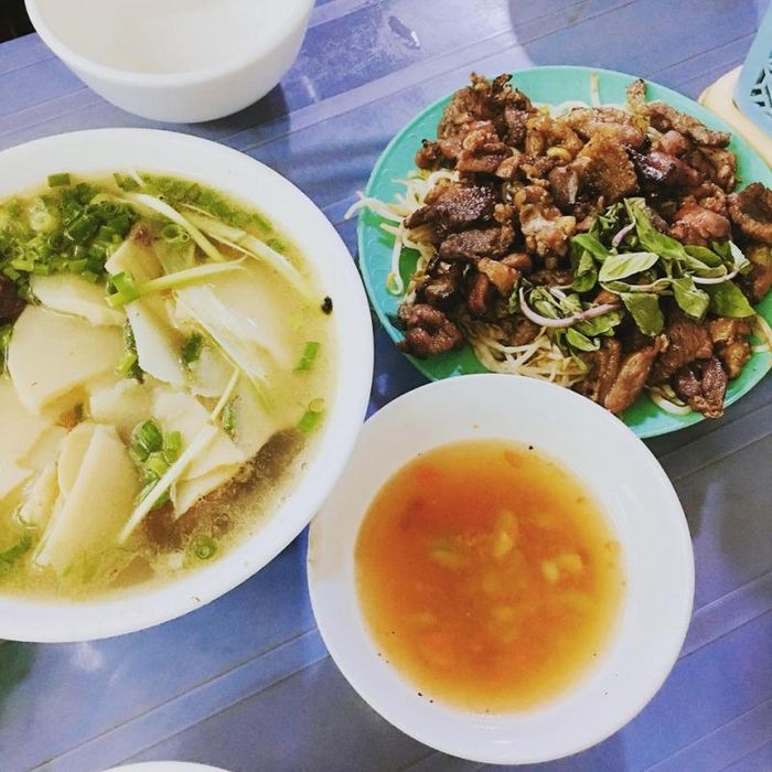 Tucked away among large fashion shops, Quán Hiền is a hidden gem that not everyone knows about. However, once you've tasted the dishes here, you'll likely find yourself returning again and again. The grilled ngan meatballs here are marinated with rich flavors, then grilled over charcoal, creating an irresistible aroma. Served with noodles and a special fish sauce, alongside a delicious bamboo shoot soup, the combination is unforgettable. The restaurant is simple and affordable, located in a small yard borrowed from a nearby kindergarten, and opens only in the late afternoon after the children have gone home. Customers park for free at a nearby DVD store.
