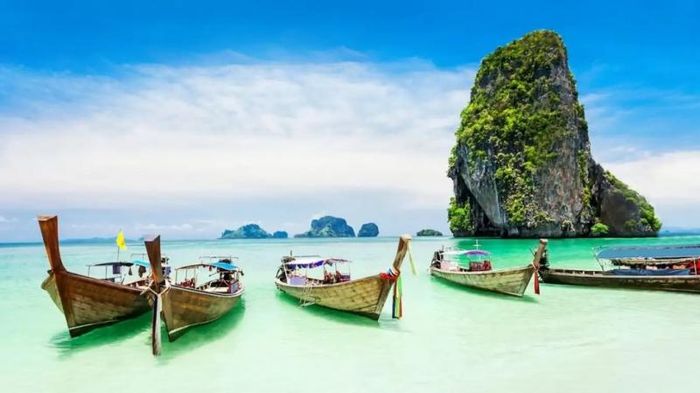 Krabi province is home to some of Thailand's most famous beach destinations, and Railay Beach tops the list as one of the finest. Regarded by many as one of Thailand's most beautiful beaches, this paradise is particularly renowned for its majestic limestone cliffs, along with its emerald waters, towering palm trees, and powdery white sands that create a picture-perfect scene. The only way in and out of Railay is by boat. Its separation from the rest of Krabi province also creates a relaxed and private atmosphere at Railay.