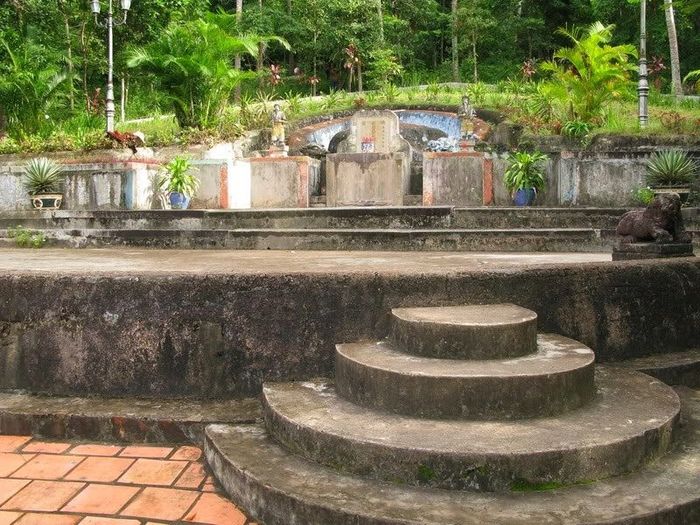The Mạc Cửu tomb lies within a secure enclosure, with stone steps transported from Guangxi by Chinese traders. The tomb is carved in a crescent shape, set into the mountainside, and resembles a resting buffalo, known as the 'sitting ox' posture. Descending the moss-covered steps brings you to the family tombs and the graves of Mạc Cửu's generals. Nearly 40 tombs are arranged in hierarchical order based on the individual's contributions. Below Mạc Cửu's tomb lies the grave of his wife, Nguyễn Thị Hiếu Túc, to the left, and to the right is the grave of his son, Mạc Tử Hoàng, with Mạc Thiên Tích’s tomb situated in the center. While Mạc Cửu is credited with founding Hà Tiên, his descendants further developed the region. Notably, Mạc Thiên Tích founded the Tao Đàn Chiêu Anh Các literary society, significantly contributing to the growth of Vietnamese literature and poetry.
