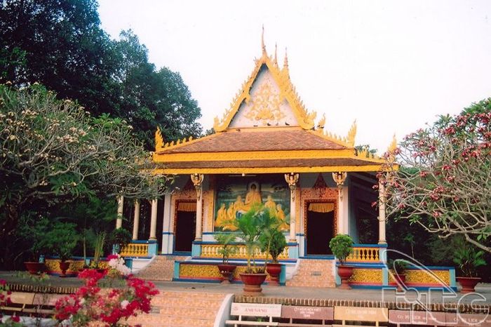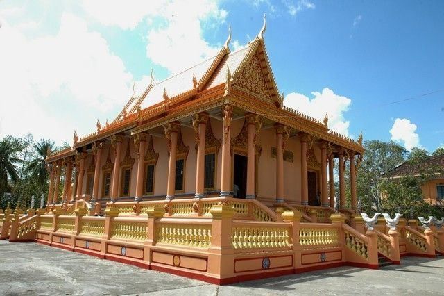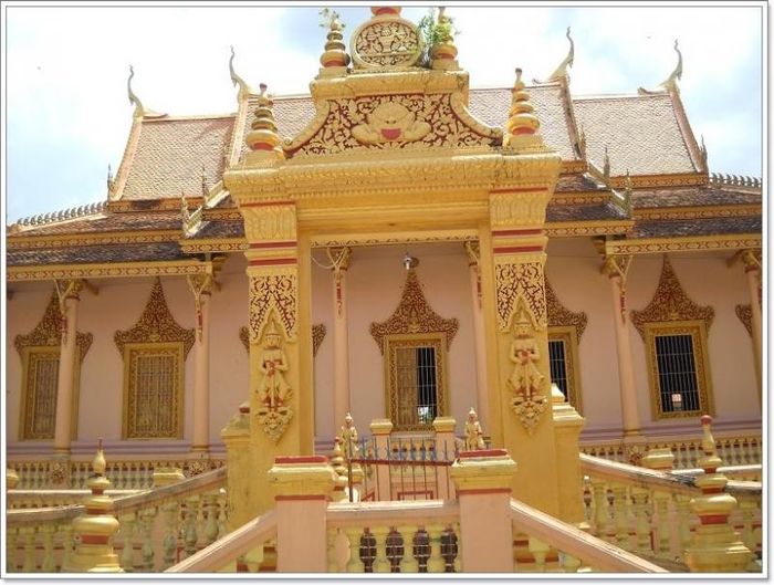 Kh'leang stands as one of the oldest Khmer temples in Sóc Trăng, dating back to the mid-16th century. The temple features a 6.8-meter-high Buddha statue seated atop a lotus pedestal. Situated on a spacious 3,825m2 campus, Kh'Leang Temple was initially constructed in 1533, initially just a thatched roof temple before being rebuilt multiple times with tiled bricks. Its current architecture stems from renovations over 80 years ago. Khleang Temple is renowned for its ancient and beautiful Khmer architecture in Sóc Trăng. Positioned centrally within the town, along the picturesque Trang River dividing the town in half, the temple sits within a large courtyard enclosed by fences adorned with traditional Khmer patterns. Beneath the cooling shade of ancient trees, its symmetrical and harmonious architectural lines integrate seamlessly with unique and diverse artistic works, many of which exhibit the distinctive features of traditional Khmer art. Amidst the Khmer artistic decorations, one can also find works from the Kinh people on the hammock door and from the Chinese on the column bodies, reflecting the cultural exchange among the three ethnic groups, who, through long-term cohabitation, have combined the quintessence of art, learning from each other for mutual development.