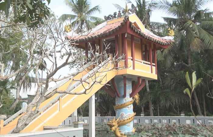 From the high platform, visitors can behold the serene beauty of thousands of lotus flowers blooming all year round. Nearby, there are many Buddha statues depicting the life of the Buddha, Sakyamuni, renouncing his princely life to seek enlightenment and bring peace to humanity. Next to the lotus pond of One-Pillar Pagoda stands a row of large statues representing powerful supernatural beings. Beneath the ancient banyan tree is a beautiful and majestic statue of Avalokiteshvara. In front of the pagoda is a magnificent shrine dedicated to the local deity, immaculately clean and beautiful. One-Pillar Pagoda, when viewed from the outside, exudes a slim and distinctive charm, embodying both the common features of Eastern temples and shrines and the uniqueness of being the only 'one-pillar' pagoda in the Mekong Delta to date. Not only a sacred place with beautiful, solemn, and ancient scenery attracting many visitors, the pagoda is also a humanitarian address with regular activities such as distributing rice, providing free meals for the poor, and offering books and study materials to underprivileged children.