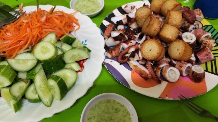 Each dish is perfectly crispy and flavorful. The green pepper salt here is blended just right, offering a unique taste that pairs wonderfully with grilled octopus. A serving of grilled octopus varies depending on market prices, but although it's a bit more expensive than average, the quality makes it worthwhile. Taking a bite of grilled octopus dipped in the green chili salt is pure heaven – the spiciness is just right, the seasoning is rich, and the octopus is tender yet firm, full of flavor.
