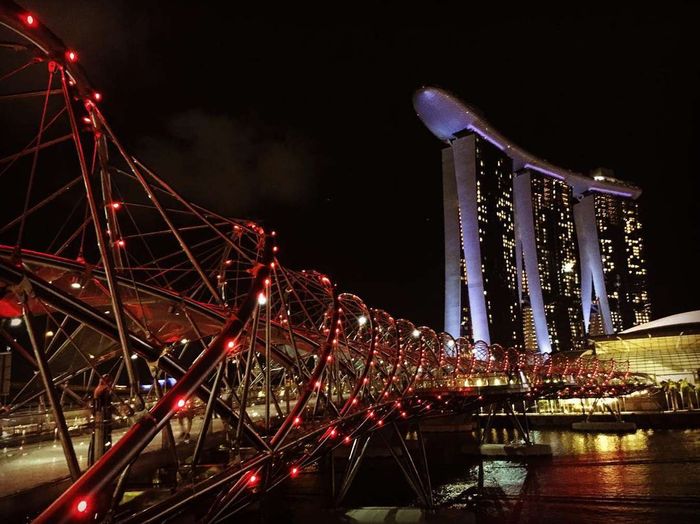 As the link between the Singapore Flyer and Marina Bay Sands, the Helix bridge is the world's first pedestrian bridge - a helical structure inspired by the DNA image. In the evening, the bridge becomes impressive with bright purple lights contrasting perfectly with the surrounding lights hour after hour.