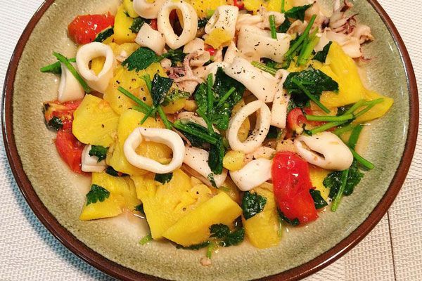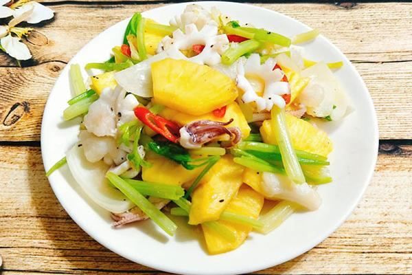 - Add the squid back to stir-fry with the pineapple, season again with spices to suit the family's taste. Finally, add edible flowers, celery, and mildly spicy chili, stir-fry until cooked, sprinkle a little pepper for a fragrant smell, and turn off the heat.
