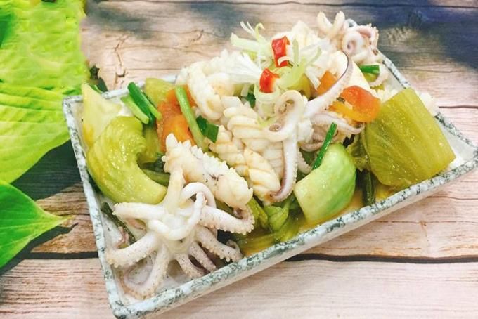 Introducing another unique dish to the list of delicious squid stir-fry recipes for all the ladies out there, it's the sour mustard green squid stir-fry. This is a unique combination of fresh and tasty tube squid with tangy and salty sour mustard greens. Sour mustard greens are considered a sour and salty vegetable that effectively stimulates the taste buds. Therefore, having a plate of sour mustard green squid stir-fry in the family meal is not just about changing the dish but also creating a delicious feeling, stimulating more appetite. This is particularly useful for family members, especially children in their developmental stage.