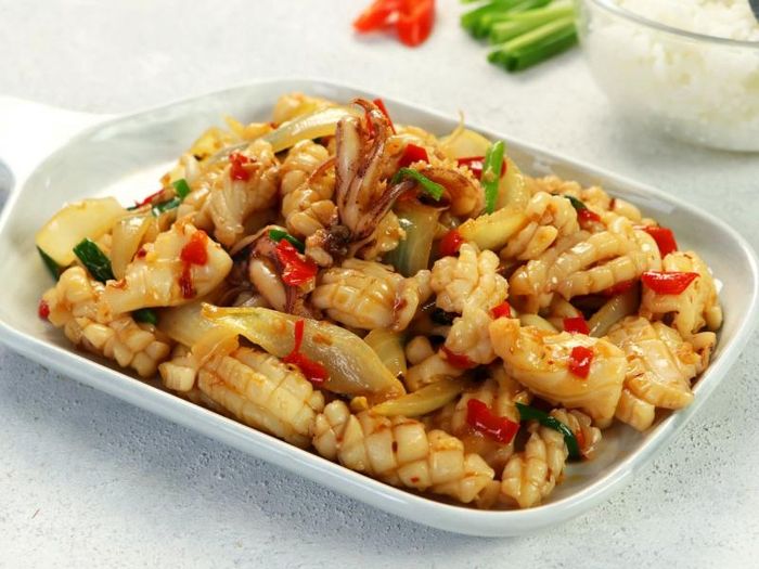 With its glossy brown color and richly flavored sauce, this dish is extremely characteristic when it comes to dishes originating from Korea. The recipe for this stir-fried squid with vegetables is also simple and not too difficult. This dish tastes delicious when served with hot rice and is also suitable if you plan to include it in the menu for entertaining guests.