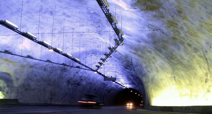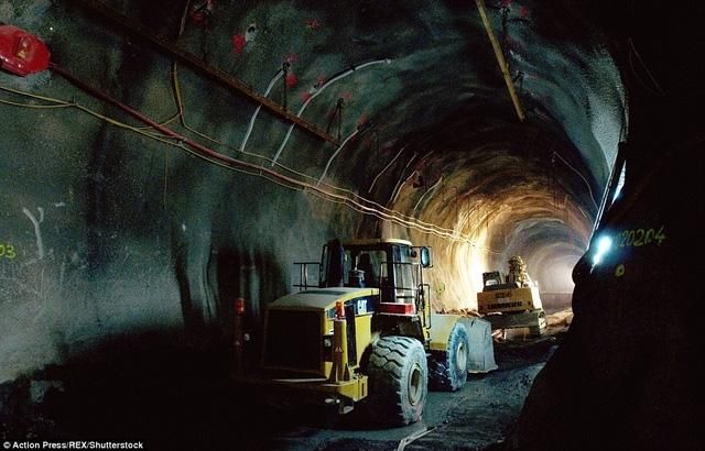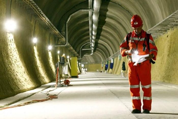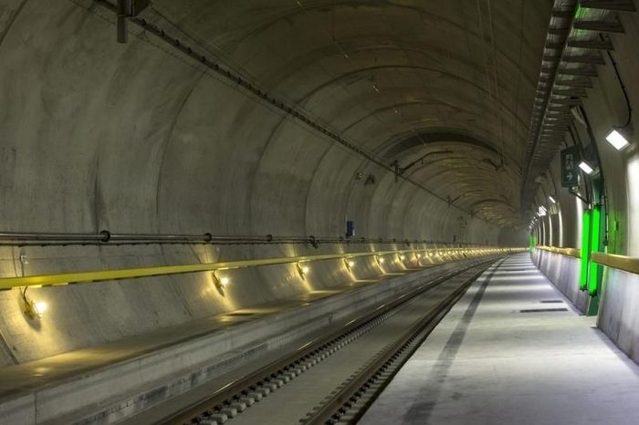 The Gotthard Base Tunnel runs beneath the Swiss Alps and is the longest tunnel in the world, stretching approximately 57 kilometers. It surpasses even Japan's Seikan Tunnel, making it the longest tunnel overall. Connecting the Swiss cities of Erstfeld and Bodio, the Gotthard Tunnel consists of two single-track tubes, each dedicated to one railway line. The tunnel is situated as deep as 2.3 kilometers below the mountain peaks, cutting through rocks that reach temperatures of up to 46°C. Engineers had to drill through 73 different types of rock, including some tough granite.