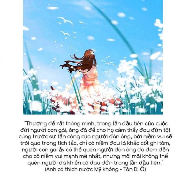 Considered as a writer specialized in youth themes, Do You Like America? is Tân Di Ổ's most successful novel on this subject. The story revolves around a love triangle between Trịnh Vy, Lâm Tĩnh, and Trần Hiếu Chính. These once passionate, lively individuals have now matured and made choices about their future partners. It's a glimpse into youth with the freshest, sweetest, and yet most bitter moments revolving around three characters with distinct personalities. There's the lively, enthusiastic Trịnh Vi, a talented and cold Trần Hiếu Chính, and a mature, calm, and decisive Lâm Tĩnh.