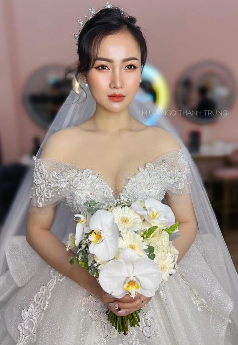 After assessing the bride's skin and providing personalized makeup style advice based on her outfit and wedding venue, Ngô Thanh Trung Make up carefully selects the right cosmetics that best match the bride’s skin tone and effectively conceal imperfections, all while using minimal products. This ensures a light, natural makeup look. Thanks to his expertise and well-equipped facilities, every client who chooses Ngô Thanh Trung Make up (Hồ Anh Khoa Academy Bridal) leaves feeling completely confident and satisfied.