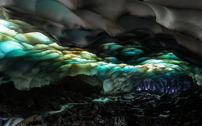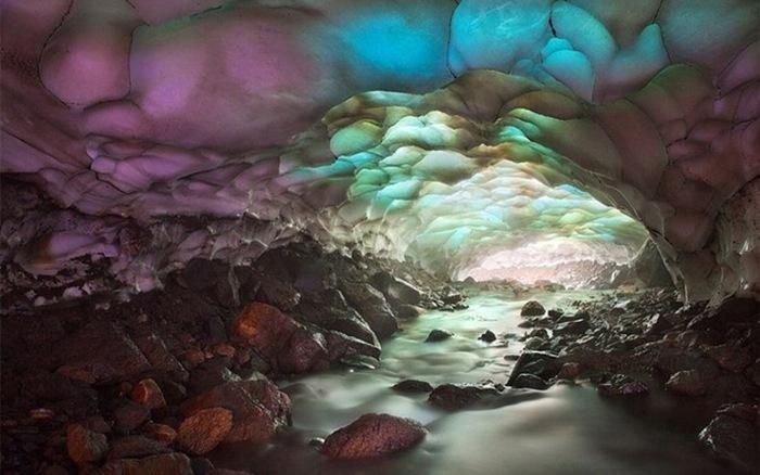 The Ice Cave is a stunning natural wonder located on the Kamchatka Peninsula in the eastern part of Russia. The cave was formed by the flow of hot water beneath snowy fields near the Mutnovsky Volcano. It stretches about 1 km long, with the melting glaciers from the nearby volcano creating a delicate ceiling that allows sunlight to filter through. The sunlight casts a spectrum of colors onto the icy structures within the cave, creating a mesmerizing effect. Discovered relatively recently, this Ice Cave is considered one of the world’s most beautiful caves, and further exploration of its unique features and ecosystem is still encouraged.