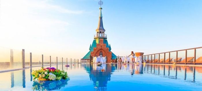 The pool appears to float in space, supported by sturdy pillars, resembling a ship suspended in the air. The hotel itself is perched atop a high hill, enhancing the dramatic effect of the pool's design. The surrounding mountains provide a tranquil environment, making your stay here more serene and enjoyable. The pool is encased in durable stone, adding to the sense of stability and safety.