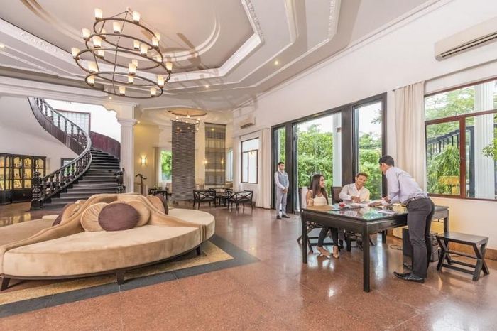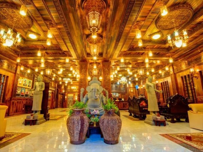 White Mansion Hotel is located in the historic center of Phnom Penh, about a 15-minute walk from the Royal Palace and the riverside. Beyond the entrance, there is a white terrazzo garden with a statue of Buddha holding a lotus flower, and upon stepping inside, a grand hall with a central round velvet sofa, shiny red granite floor spread throughout the hotel. A private lounge is an excellent relaxation spot with many soft seats. The hotel also features a small craft shop tucked away in another corner. Vivid portraits of animals such as monkey heads adorn the walls, while the beautiful teakwood staircase winds up to the rooms.