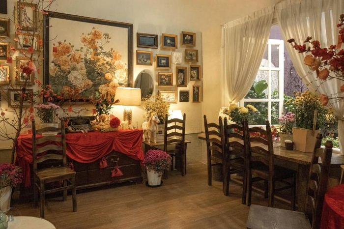 Though it may seem unusual at first, Ban Công Cafe is actually quite familiar, located in a charming old French villa on Đinh Liệt Street. The cafe embodies an old-world, aristocratic style, making it one of the most talked-about spots in Hanoi right now. The space retains its original tiled floors, faded yellow walls, wooden staircases, and rustic wooden shelves topped with seasonal floral arrangements. The balcony brings the beauty of spring right to the heart of Hanoi's Old Quarter, offering a fresh outlook for a positive and vibrant year ahead after a period of change.