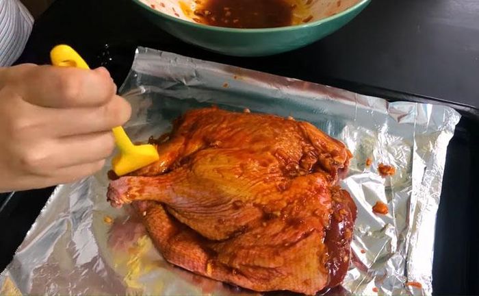 - After 30 minutes of grilling, evenly spread the sauce over the entire duck skin. To prevent the duck wings from being scorched, fold them back with aluminum foil and continue grilling for another 20 minutes.