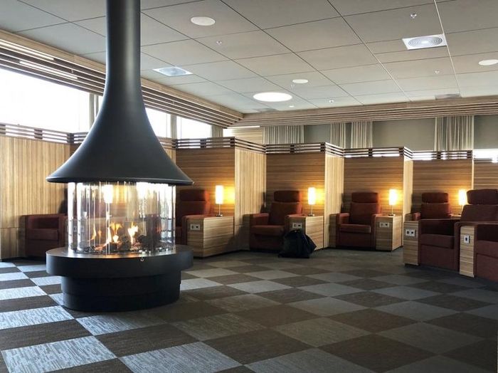 The highlight of the Icelandair Saga Business Class Lounge is the cozy fireplace, which serves as the most popular gathering spot for passengers. The lounge also offers a dining area with light snacks. Another impressive feature is the wide selection of spirits, including Reykjavik Distillery’s specialty liquors, small-batch Reyka Vodka, Tanqueray No Ten Gin, and other fine drinks. Additionally, Iceland's Gull Beer and a variety of bottled beverages are available. The lounge serves bread, cheese, hot soups, and pastries. Self-service coffee, tea, juices, still and sparkling water, soft drinks, and alcohol are also offered. The lounge is equipped with restrooms, including a family restroom, and showers, featuring amenities from the famous Blue Lagoon.