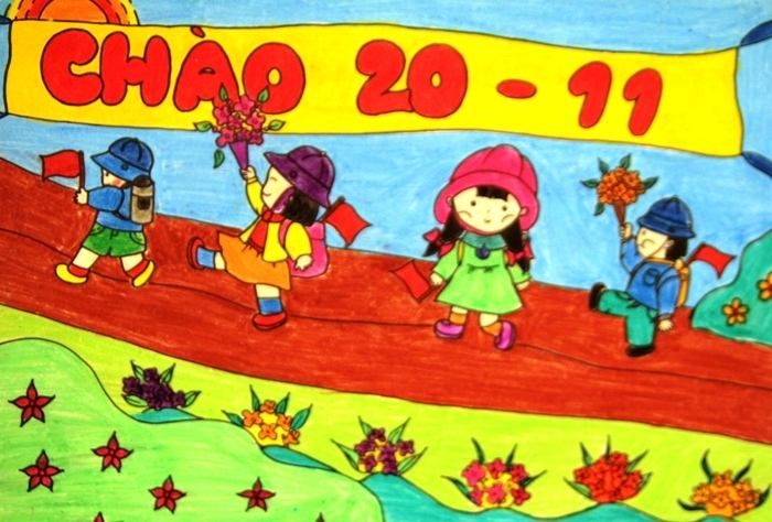 The grand rally is an expression of thanks and appreciation to all devoted teachers who have dedicated their lives to educating and nurturing students. This is also the theme of this painting, depicting students marching in a rally to congratulate their teachers.