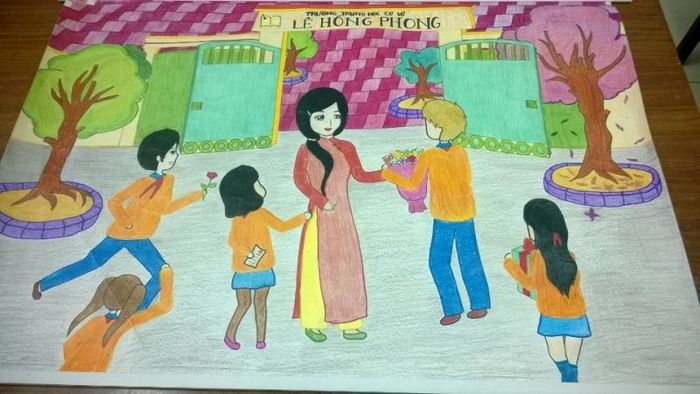 Those are warm words, just like the theme of this painting celebrating November 20th. She's our classroom teacher, so simple and so kind. She is indeed the second mother for each of us students. Gratitude day is here, and all we know is to give her the most vibrant bouquets, wishing she stays forever young to guide many more classes to become better individuals, dear teacher!
