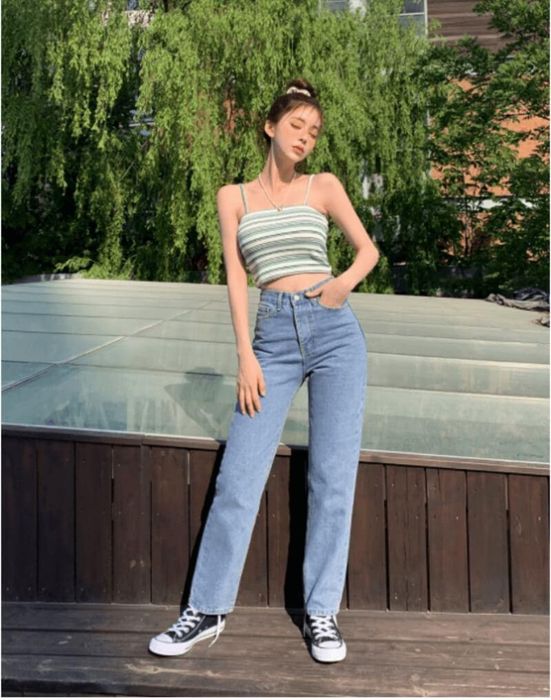 This type of pants suits various body shapes, helping to accentuate the figure and effectively conceal flaws. If you have an hourglass figure, you'll be amazed at the effectiveness of these high-waisted jeans. They help conceal excess belly fat, creating a naturally petite waistline. When buying this style of jeans, consider adding a cute little belt to create a focal point.
