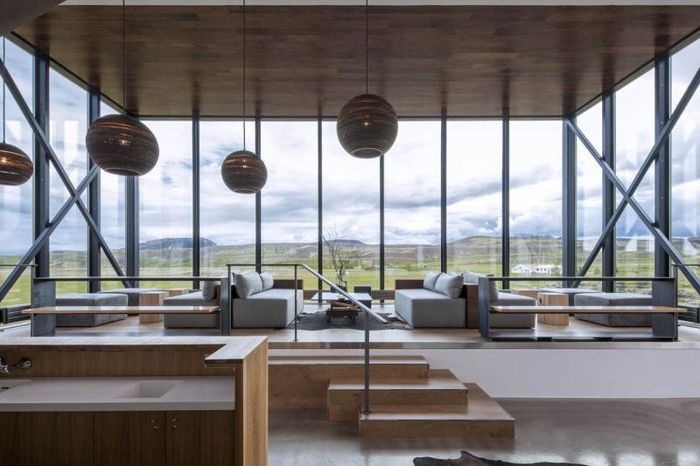 Outdoor geothermal hot tubs overlooking volcanoes. Glass-surrounded dining halls for fine cuisine. Observation decks and permanent astronomical observatories for stargazing and hunting the Northern Lights. Ranga Hotel blends the elegance of a hunting lodge with the coziness of a log cabin. So, whether it's your bedroom or suite, expect a snug yet spacious retreat crafted from wood with breathtaking views. Here, a guest lounge and bar serve up hot chocolate or mulled wine.