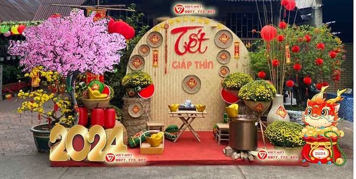 To enhance the traditional Tet atmosphere, consider incorporating the zodiac animal of the year into your display. For example, in 2024, you could feature a dragon model surrounded by flower pots. Each year, you can select a different animal from the zodiac to match the calendar year.