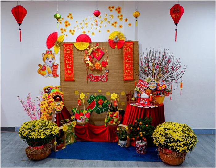 According to Mytour, setting up a Tet decoration featuring a cake-making scene not only creates a visually pleasing space but also helps children better understand the culinary traditions of Vietnam. With vibrant colors and interactive elements, you can craft a fun and unique atmosphere for the celebration. This idea strikes a perfect balance between familiar and fresh, adding both warmth and novelty to your decorations for Tet 2024.