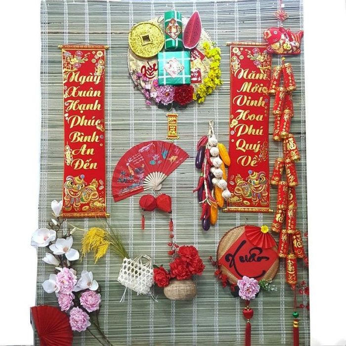 The mats, often made from bamboo, rattan, or palm, are typically used as backgrounds for red couplets, apricot and peach blossoms, Tet trays, and symbolic animal figurines representing the zodiac year. These decorations transport us to a simpler time with its warm hearth, the Tet pole, firecrackers, and the iconic green bánh chưng. In Vietnamese culture, decorating with bamboo mats is also believed to bring prosperity and good fortune, as the natural materials are associated with positive feng shui. Additionally, you can set up a small kitchen scene with a fire, bánh chưng, Tet pole, and firecrackers to complete the traditional Tet atmosphere.