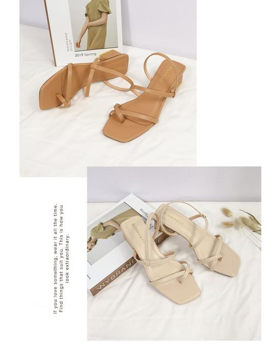 - The sandals feature a fine strap design that wraps around the heel and crosses over the foot, offering a chic and attractive silhouette.