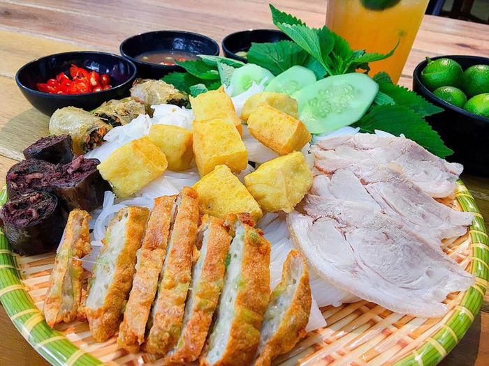 Bún Đậu Mắm Tôm is a simple, rustic dish from Northern Vietnam, commonly enjoyed as a light snack or street food. It has become a beloved specialty in Vinh City, Nghe An, and is a must-try for visitors. The dish typically consists of fresh vermicelli noodles, crispy fried tofu, Vietnamese-style sausage (chả cốm), fermented pork (nem chua), and dog sausage (dồi chó), served with shrimp paste (mắm tôm) mixed with lime, chili, and fresh herbs like perilla, mint, and lettuce. Its affordability and deliciousness make it popular among the locals, with street vendors thriving in the business.