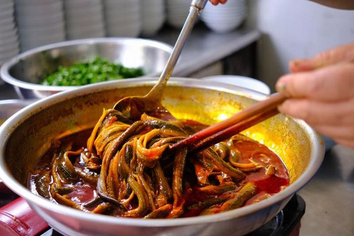 Making a bowl of traditional Nghệ An eel porridge requires great attention to detail from the chef. First, the wild eels are carefully selected, and the rice for the porridge must be of the finest quality. The eels are meticulously cleaned with ash to remove any slime, then they are gutted, and the meat is seasoned and stir-fried. The key ingredient in this dish is turmeric, which not only gives the porridge its signature golden color but also adds richness and flavor while masking any fishy smell. The eel is stir-fried with chopped chili, fried shallots, pepper, and the distinctive fragrant herbs that grow only in Nghệ An and Hà Tĩnh. The final result is a tender and flavorful eel that is perfectly cooked, with the yellow glow of turmeric and green accents of fresh herbs, making it both a feast for the eyes and the taste buds. If you're in Vinh, don’t miss the chance to savor this iconic dish, Cháo Lươn.