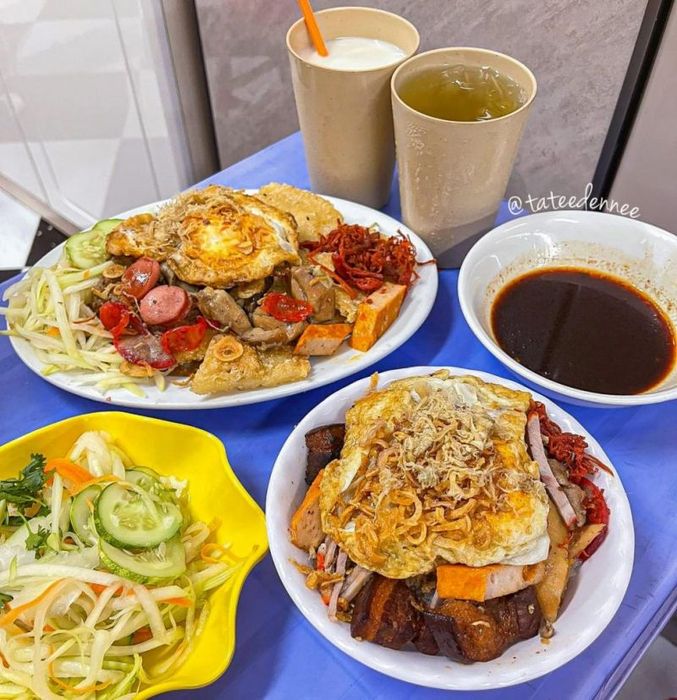 The Bún Đậu platter in Vinh City is a generous serving, featuring tightly pressed rice noodles made from rice flour, golden fried tofu that’s crispy on the outside yet soft and nutty inside. With every bite, you’ll taste the perfect balance of crispy and tender textures. The dish also includes slices of boiled pork leg and crispy chả cốm with a rich, chewy texture. Complementing the dish are fragrant herbs like mint and perilla leaves, along with fresh cucumber slices. The secret to this dish’s mouthwatering appeal lies in the shrimp paste sauce, which is prepared by adding a couple of kumquats, a pinch of sugar, and freshly sliced chili. The result is a well-balanced sauce with a perfect harmony of sweetness, saltiness, tanginess, and heat, enhancing the flavors of this delightful dish.