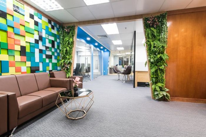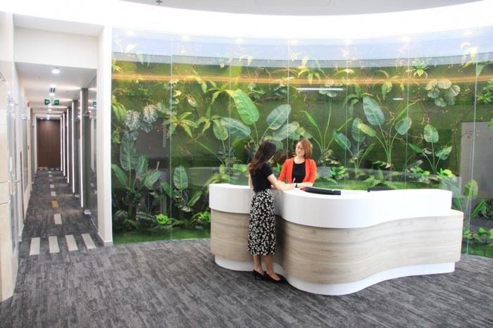 - Lễ tân chuyên nghiệp, văn phòng sang trọng, hiện đại, đầy đủ tiện ích như: phòng họp, khu vực tiếp khách, pantry, chỗ làm việc,...