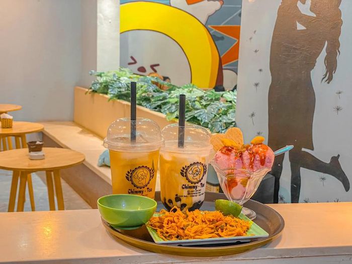 Chimmy Tea has a spacious area with 2 floors and a balcony for those who enjoy the sky view while sipping their drinks here. The interior is designed in a modern style, with colorful walls and intricate murals suitable for photo enthusiasts. In the evening, the café is adorned with twinkling lights, creating a romantic atmosphere for couples. Besides milk tea, Chimmy Tea also offers lemon tea, fruit tea, yogurt smoothies, soda, and delicious snacks. If you ever visit Cam Ly - Luc Nam, be sure to drop by Chimmy to explore.