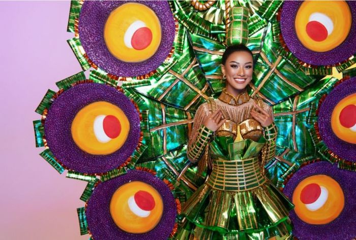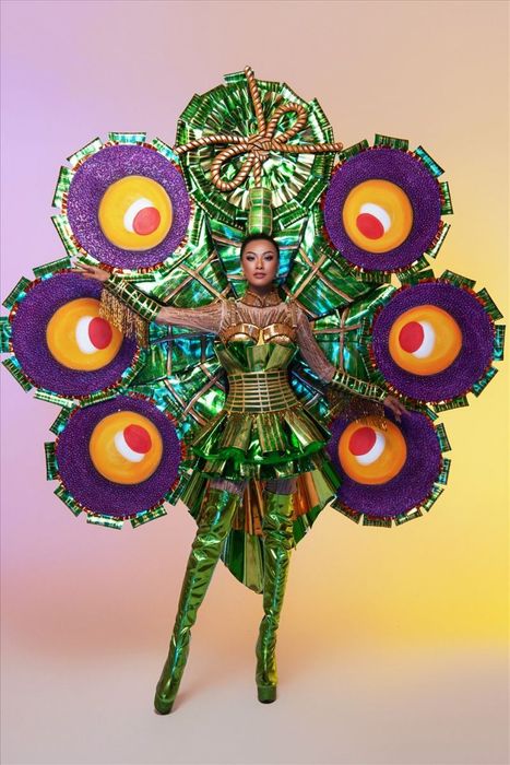 Designed by Khoa Lỗ, the 'Ai tét hông' costume was inspired by the distinctive cuisine of Can Tho, Kim Duyên's hometown, particularly the purple-streaked green 'Tét' cake. The costume's structure was carefully crafted to ensure it would flare out dramatically when Kim Duyên struck a pose. The back of the costume featured a grand display of the colorful 'Tét' cake, with vibrant and eye-catching hues. Wearing this national outfit, Á hậu Kim Duyên radiated strength, power, and personality.