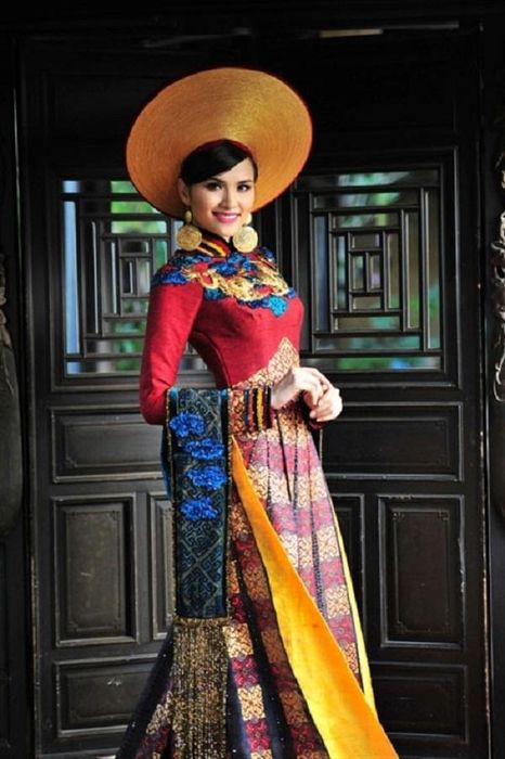 One of the most unique costumes worn by a Vietnamese representative at the Miss Universe pageant was the four-panel áo tứ thân worn by Á hậu Vũ Thị Hoàng My. This national costume was designed by Thuận Việt.