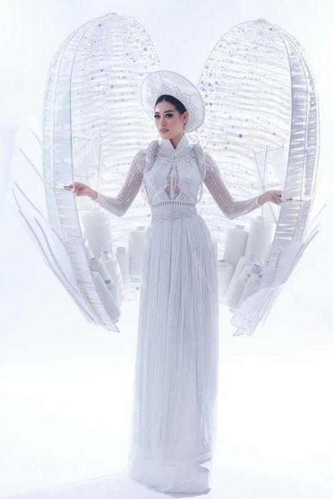 The costume, named 'Kén Em', was created by designer Khoa Lỗ and features a modernized áo dài paired with a headpiece resembling a cocoon made from silk thread. The intricate handwoven technique, combined with foreign macrame knotting, symbolizes the traditional silk weaving process. The dominant white color and the elegant áo dài silhouette emphasized the graceful, timeless beauty of Vietnamese women.