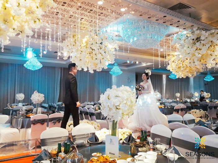 Seasons Wedding Restaurant hosts 4 spacious halls designed elegantly and in line with current trends. This not only creates a romantic atmosphere for the newlyweds on their wedding day but also serves as a beautiful check-in spot for guests. Additionally, in terms of food, customers can choose from a pre-set menu in traditional style or create their own menu under the guidance of professional chefs.