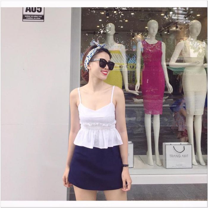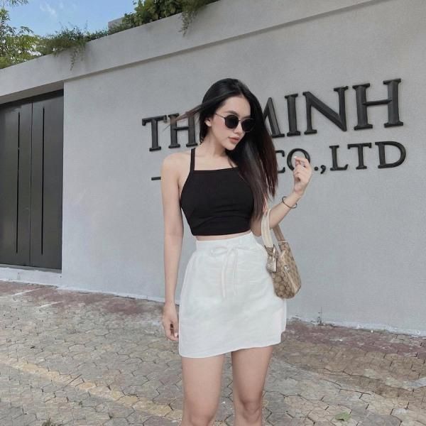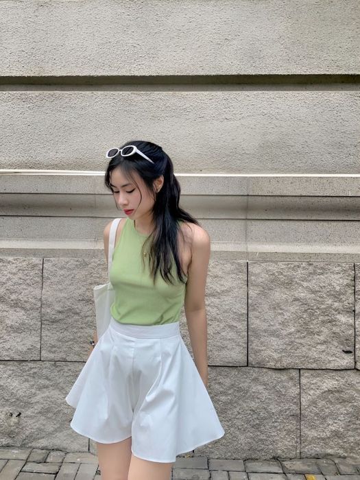 The combination of skirt-like shorts with tank tops helps our ladies cleverly flaunt their curves. Opt for cool-toned outfit colors like blue, white, pink, beige, etc., which are suitable for hot summer days. This mix-and-match style brings about a youthful, dynamic, equally seductive, and refreshing vibe. It's a good suggestion for beachwear this summer.