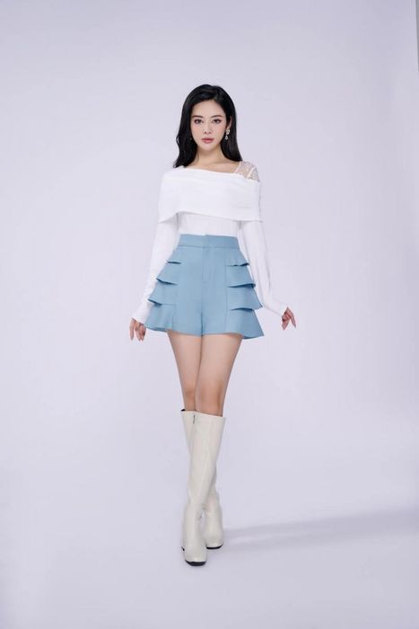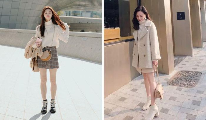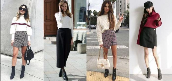 This outfit is perfect for those days when the weather is getting colder, suitable for strolling around the streets or going to cafes with friends. You can combine a knit top with flared or A-line skirt-like shorts. To keep your body warmer, you can also wear 3D socks or high-neck boots, both are perfect choices.