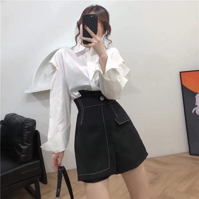 A basic button-up shirt with faux skirt shorts can accentuate your upper body, bringing about absolute sophistication and refinement. Mixing skirt-like shorts with patterned button-up shirts also creates a sense of harmony and avoids monotony. For ladies in the summer, this may be the ideal choice, especially for those with fair skin.