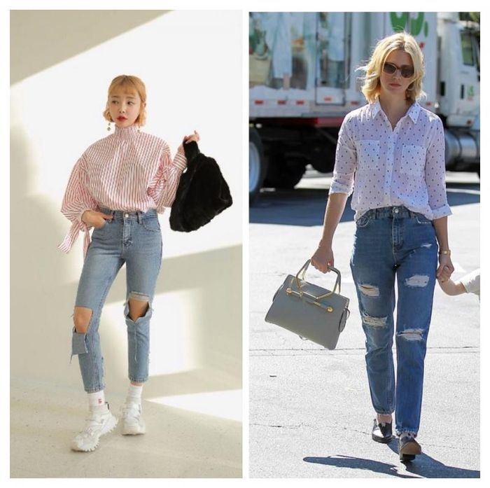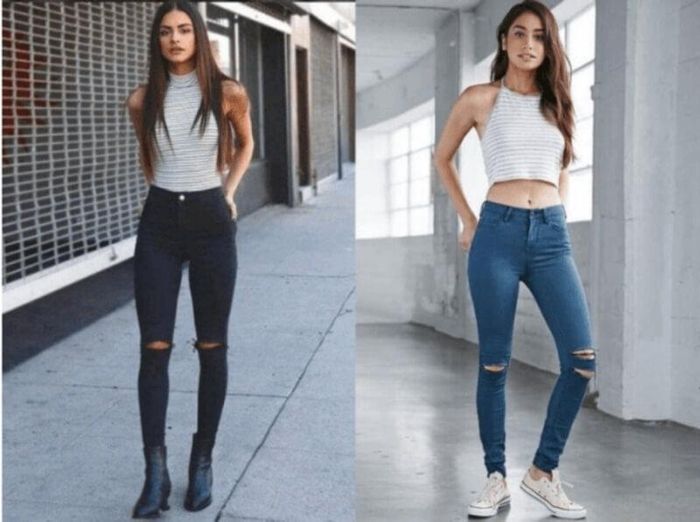 When you combine this duo with elegant high heels and a small handbag, the result will surprise you. The feminine, graceful touch of the heels will make you look more refined and move more fluidly, while still maintaining the rebellious vibe of ripped jeans that suit your style perfectly.