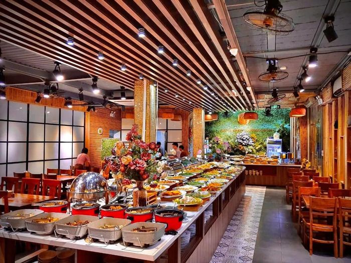 Huong Thien Vegetarian Buffet can accommodate up to 200 guests with a 2-story design. Here, diners immerse themselves in a serene space, enhanced by meditative music, fostering relaxation during meals. The staff here are highly professional, always with a smile on their faces.