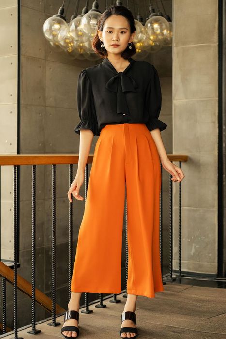 Not only the wide-leg trousers, but culottes trousers are also a common office wear style in modern times. Pairing soft culottes with stylish tops creates an extremely chic yet elegant outfit. The ideal length for culottes trousers you should choose is not too long to drag on the ankles, causing clumsiness, and not too short to expose too much of the upper calves, creating a childish and immature impression.