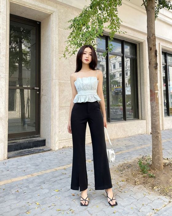 The combination of a croptop and flare pants has become a popular fashion trend among Vietnamese youth in recent years. You can often spot this pairing in TikTok videos, Instagram ootd posts, or fashion vloggers' mix and match clips.