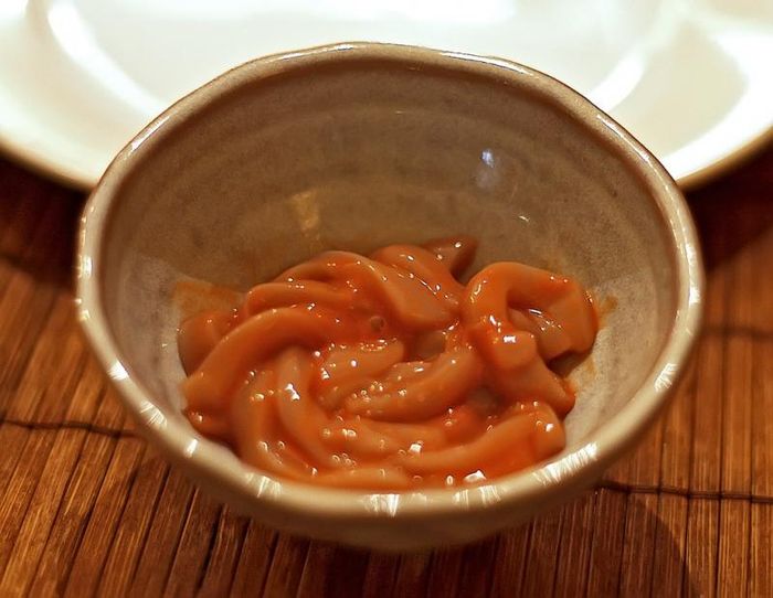 Wasabi (a Japanese condiment), mirin (a type of alcoholic beverage), yuzu (a Japanese citrus fruit), and pepper are also added to the mixture to create flavor and taste, depending on the chef's preference. Other types of shiokara like hotaru ika no shiokara are made from flying squid, uni no shiokara from sea urchin, and aim no shiokara from mysidacea. The taste of Shiokara is slightly salty and fishy, similar to the flavor of salted herring in Europe. However, the somewhat slimy and chewy texture may be challenging to digest.